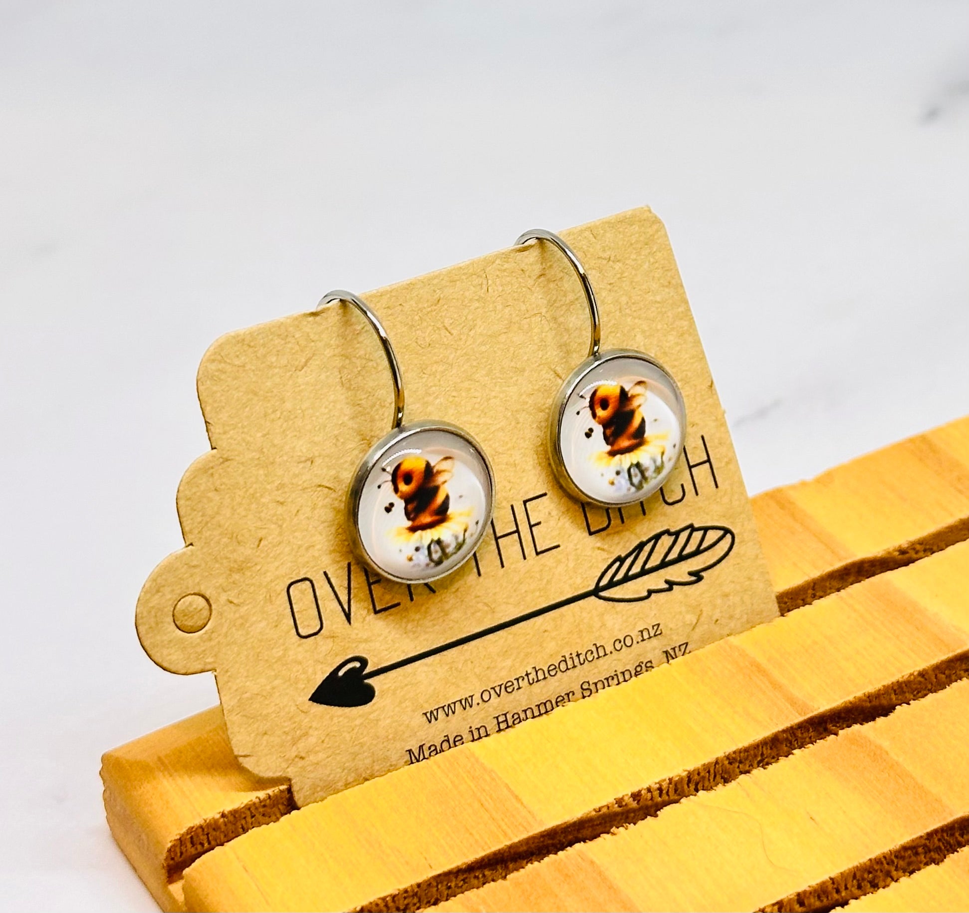 Glass cabochon earrings set in hypoallergenic stainless steel leverback bezel.