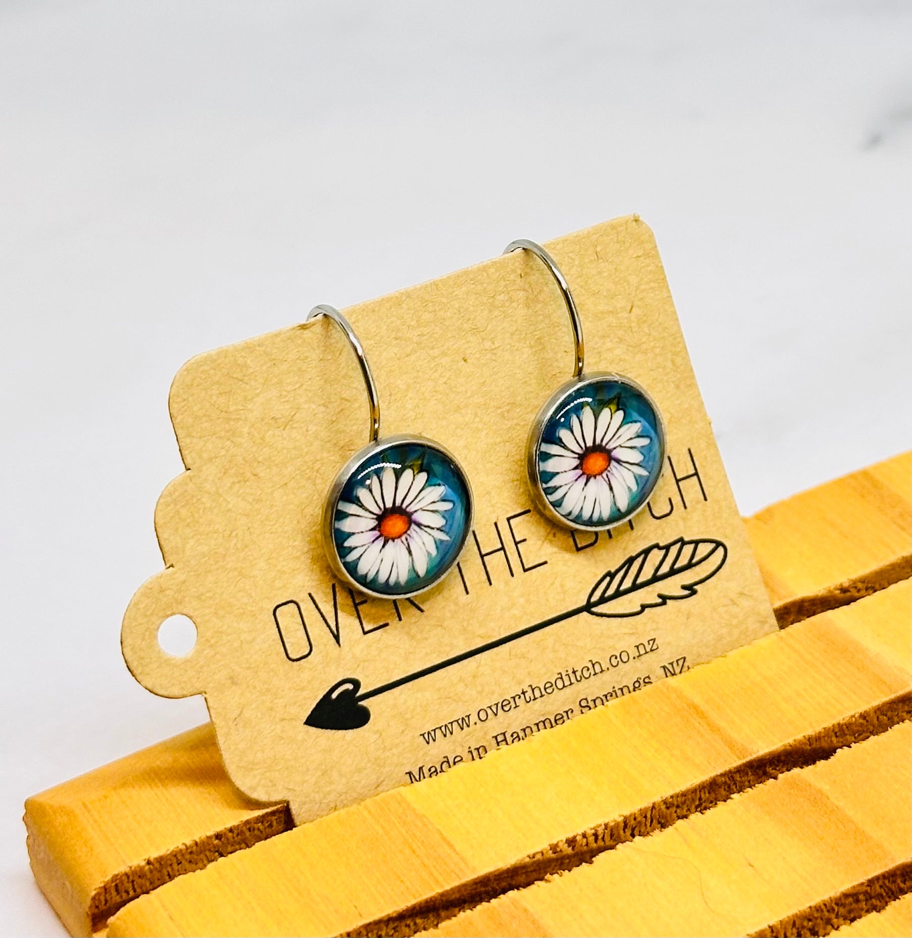 Glass cabochon earrings set in hypoallergenic stainless steel leverback bezel.