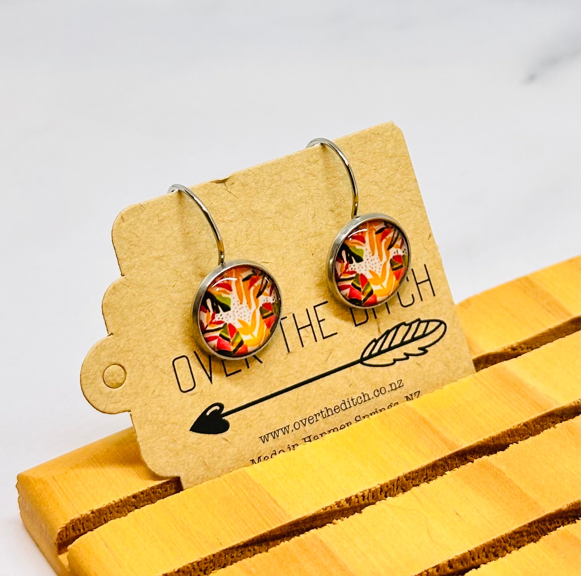 Glass cabochon earrings set in hypoallergenic stainless steel leverback bezel.