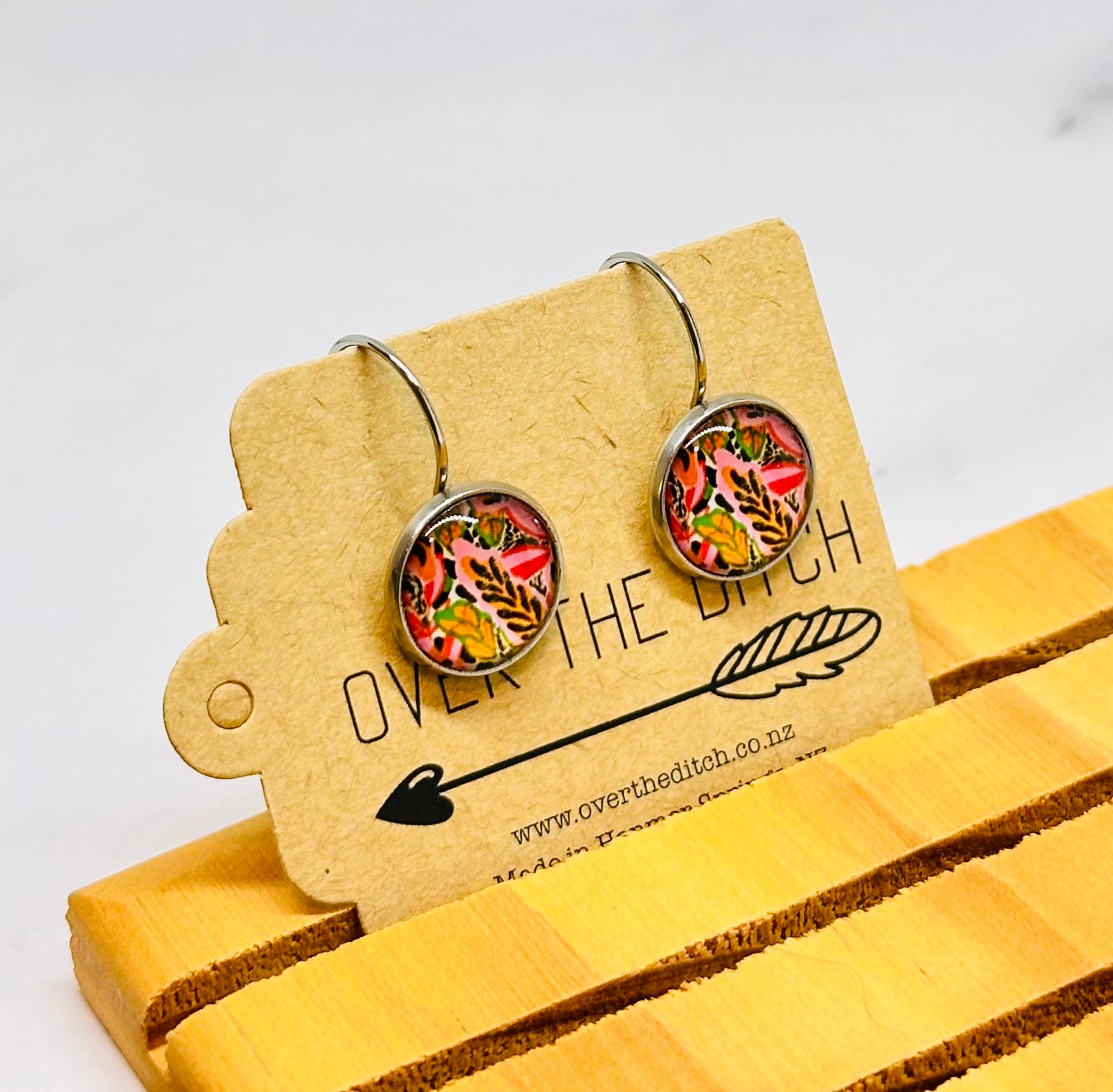 Glass cabochon earrings set in hypoallergenic stainless steel leverback bezel.