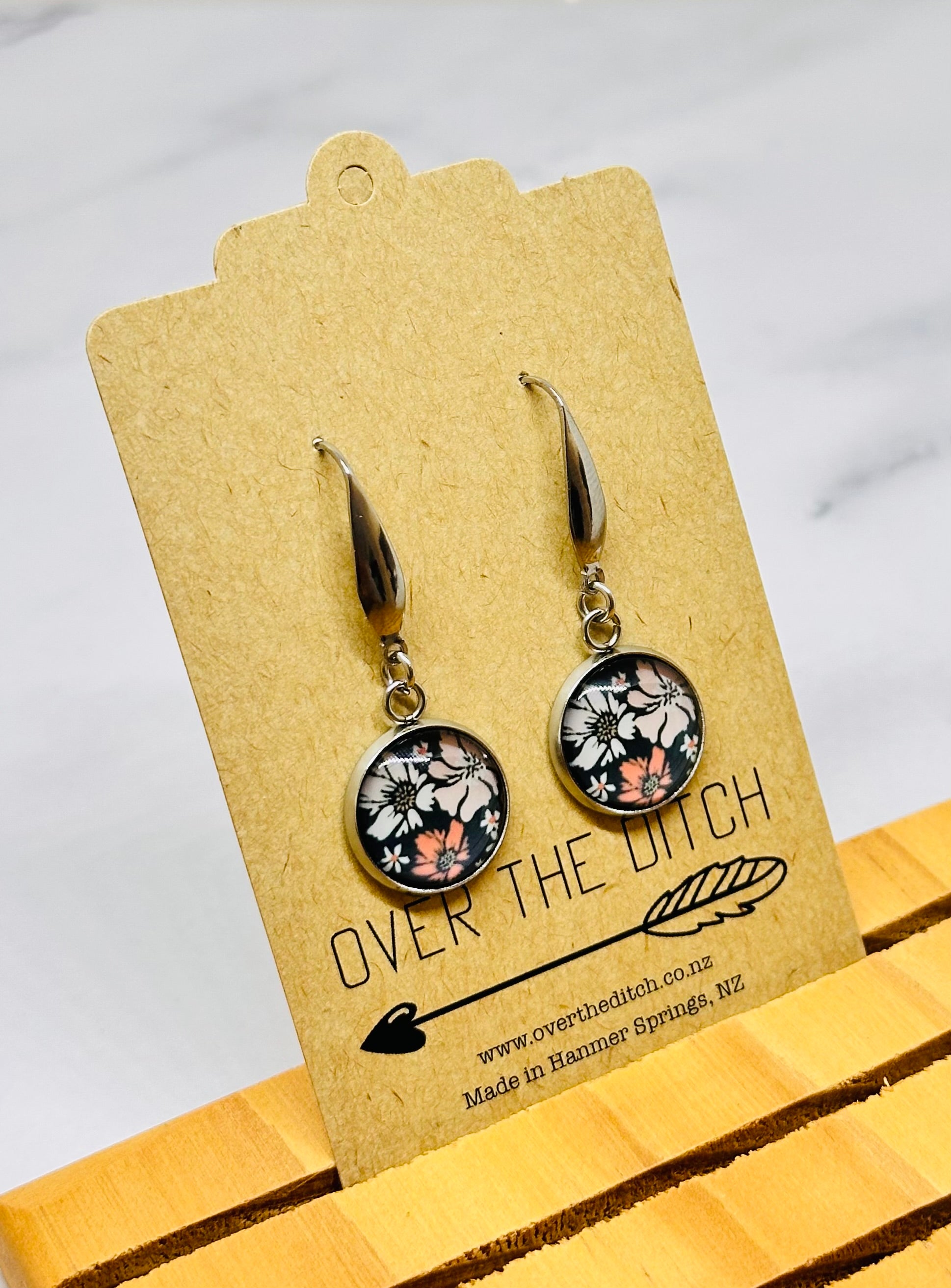 Our new pendant earrings featuring your favourite domes, set in hypoallergenic stainless steel hook bezels—perfect for sensitive ears.